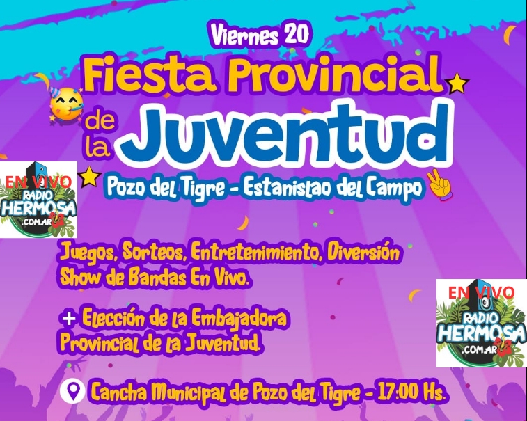 Este viernes la fiesta provincial de la juventud lo podes vivir a pleno por las pantallas Facebook de Radio Hermosa y Formosa Tv, Este evento en particular te invita a no faltar ya que viene cargado de juegos, entretenimiento, sorteos, diversión para todos los presentes, show en vivo, y como si fuera poco también se estará eligiendo a la embajadora Provincial de la Juventud.
